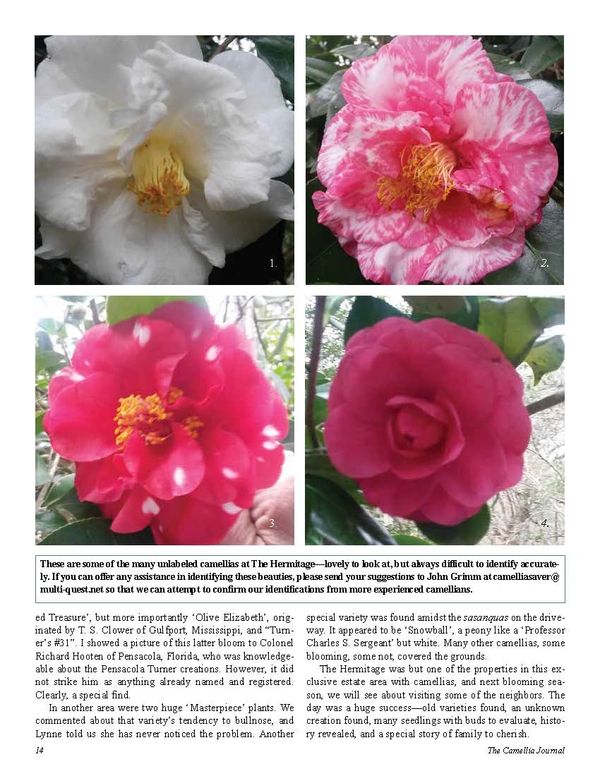 Then we spotted what was clearly a seedling; its caliper was too small to be from original plantings, and the owners had not added any plants in this area. It was about seven feet tall with a beautiful, but old bloom. We told Lynne that it appeared worth registering and we would return to propagate and take pictures when more perfect blooms were available. But the real finds were along a path to the rear where the varieties were identified by some old signage—‘Ville De Nantes’, ‘Mrs. Hooper Connell’, and ‘Scent-ed Treasure’, but more importantly ‘Olive Elizabeth’, originated by T. S. Clower of Gulfport, Mississippi, and “Turner’s #31”. I showed a picture of this latter bloom to Colonel Richard Hooten of Pensacola, Florida, who was knowledgeable about the Pensacola Turner creations. However, it did not strike him as anything already named and registered. Clearly, a special find.